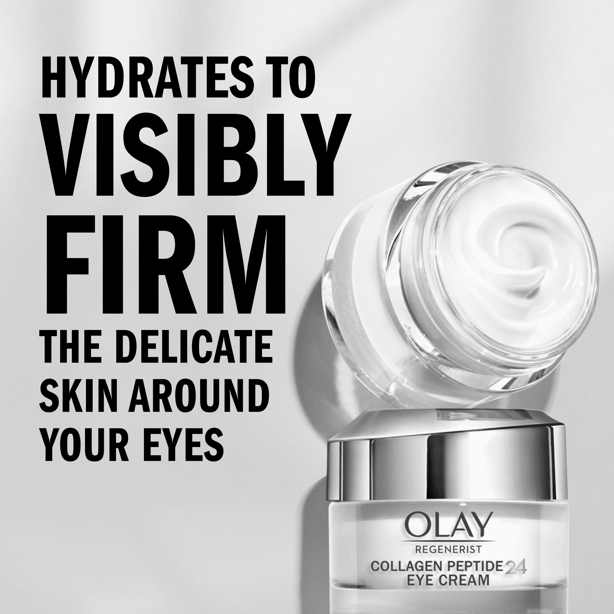 Your skin deserves plumping moisture with olay regenerist collagen peptide 24. We're giving you transformative collagen peptide in one powerful, fragrance-free eye cream. This formula absorbs quickly, giving you 24 hours of hydration without a sticky, greasy feeling. It's specifically formulated with tried-and-true ingredients, like collagen peptide and vitamin b3+, to transform the look of your skin. And the longer you use this eye cream, the better your skin will look and feel. Immediately after use, puffiness under your eyes will be reduced and your eyes will look refreshed. On day 1, your eyes will look younger and the skin around them will appear brighter. With one week of use, you'll see a minimization in dark circles, fine lines, and crow's feet. You will also see an improvement in sagginess and elasticity around your eyes. Tap this cream around your eye area morning and night for vibrant and visibly nourished eyes. Stand up for ingredients you believe in and stand firm with your skin with olay regenerist collagen peptide 24. We guarantee you'll love your olay product! If you are not satisfied, we'll give you your money back via a prepaid card. Must submit within 60 days of purchase. Call toll-free 1-855-845-9797 or visit olay.Com/guarantee.